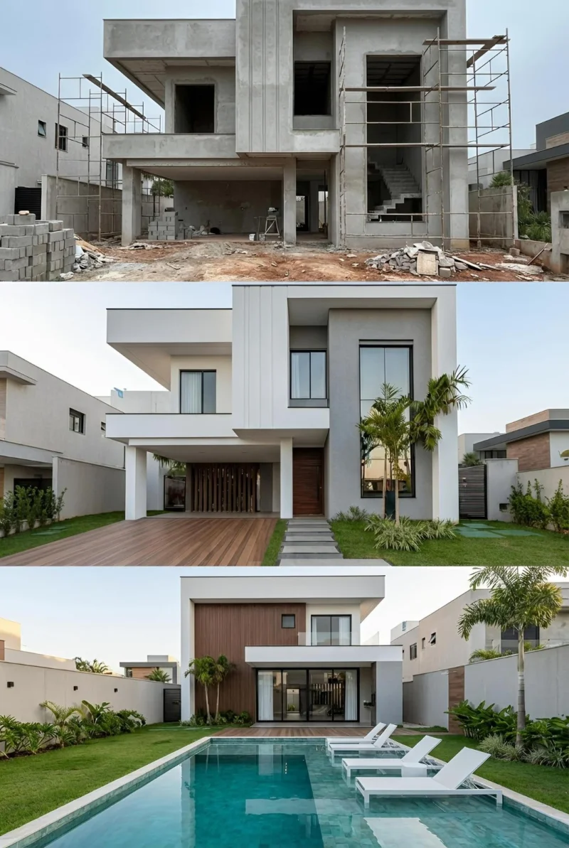 Villa projesinde kaba sıva öncesi ve sonrası uygulama sürecini gösteren saha çalışmaları.